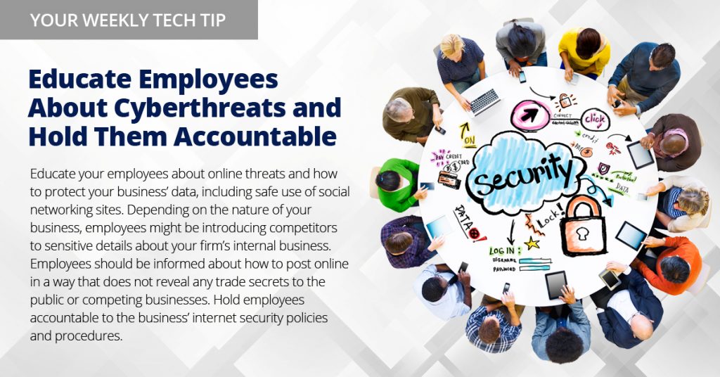 Educate your employees about online threats and how to protect your business’s data, including safe use of social networking sites. Depending on the nature of your business, employees might be introducing competitors to sensitive details about your firm’s internal business. Employees should be informed about how to post online in a way that does not reveal any trade secrets to the public or competing businesses. Hold employees accountable to the business’s Internet security policies and procedures.